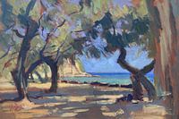 De olijfgaard aan het Marmari Strand in Loggos op het onbedorven idyllische Grieks eiland Paxos. Daar waar ik sinds 1988 mijn hart verloor aan de prachtige olijfgaarden, cipressen, witte "pebble" stranden, met azuur-aqua gekleurd zeewater gevulde baaien, hoge cliffen, zeegrotten en zoete Griekse dorpjes. De heerlijke geur van olijfhout en de zilte Ionische Zee.