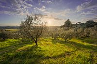 Olijfgaard in Alta Maremma. Panoramisch landschap in Casale Marittimo. Zee aan de horizon. Casale Marittimo, provincie Pisa, regio Toscane, Italië Europa.