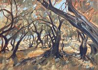 Tijdens mijn eerste bezoek aan Paxos in 1987 kwam ik terecht in het vissersdorpje Loggos. Sindsdien ga ik er regelmatig heen. Het eiland is klein maar biedt verrassend veel leuke en interrassante sites. Ik ben er geïnspireerd geraakt door de prachtige baaien, olijfgaarden, schilderachtige dorpjes, verlaten molens en lokale huisjes. Het schilderij dat u hier ziet, betreft een op hellingterrassen aangelegde olijfgaard boven Marmari Beach, nabij het dorpje Loggos. Kunt u zich het gestjirp van de cicades en de geur van olijfhout in de brandende zon voorstellen? Ik wens u veel genoegen met de aanschaf van een prachtige reproductie van deze olijfgaard langs het Marmari Strand van Loggos in Paxos.