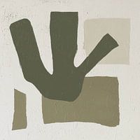 grafisch spel van organische vormen en aardetinten, waarbij olijfgroen de dominante kleur is. De compositie bestaat uit een centrale, handvormige figuur met drie uitgespreide "vingers", die zich visueel onderscheidt van de meer geometrische vlakken in beige en bruin. Deze contrasterende vormen creëren een intrigerend spanningsveld…