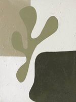 harmonieuze compositie van abstracte vormen in aardetinten, waarbij vooral olijfgroen en zandkleur de hoofdrol spelen. De vormen lijken uit een collage te zijn opgebouwd, met duidelijke, organische contouren die doen denken aan natuurlijke objecten of silhouetten van takken en gesteenten. De achtergrond in offwhite versterkt de…