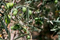 Zomer, olijfboom (Olive Europaea), olijftakken met grijsgroene bladeren in olijfgaard op het platteland van Andalusië, Andalucia, Spanje. Spaanse olijven rijpen in de zon van een Mediterrane klimaat, zomergevoel in de olijfboomgaard. Ingrediënt voor tapas en de productie van olijfolie. De olijftak is het symbool van vrede.