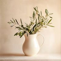 In een elegante kan van fijn porselein liggen tere olijftakken met frisgroen gebladerte. Zachte schaduwen dansen op het oppervlak, terwijl het licht zachtjes speelt rond de bleke, aardse tinten van de kan. Deze harmonieuze combinatie straalt rust en tijdloze schoonheid uit, perfect voor een moment van bezinning.