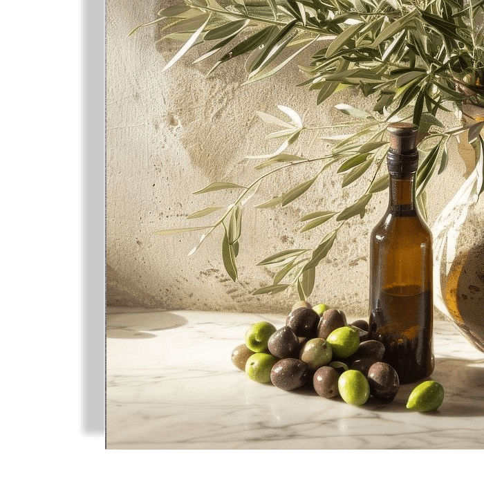 Dit rustieke stilleven toont een liefdevol gerangschikte compositie van olijven, olijfolie en verse rozemarijn op een verweerd houten oppervlak. De warme tinten van het hout en de gouden reflecties van de olijfolie creëren een uitnodigende en authentieke sfeer die doet denken aan de mediterrane keuken. Dit kunstwerk is perfect voor keukens en eethoeken en brengt een vleugje traditie en natuur in huis.