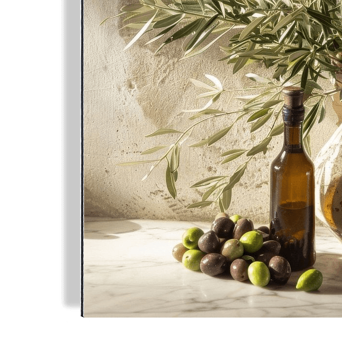 Dit rustieke stilleven toont een liefdevol gerangschikte compositie van olijven, olijfolie en verse rozemarijn op een verweerd houten oppervlak. De warme tinten van het hout en de gouden reflecties van de olijfolie creëren een uitnodigende en authentieke sfeer die doet denken aan de mediterrane keuken. Dit kunstwerk is perfect voor keukens en eethoeken en brengt een vleugje traditie en natuur in huis.