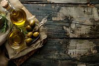 Dit rustieke stilleven toont een liefdevol gerangschikte compositie van olijven, olijfolie en verse rozemarijn op een verweerd houten oppervlak. De warme tinten van het hout en de gouden reflecties van de olijfolie creëren een uitnodigende en authentieke sfeer die doet denken aan de mediterrane keuken. Dit kunstwerk is perfect voor keukens en eethoeken en brengt een vleugje traditie en natuur in huis.