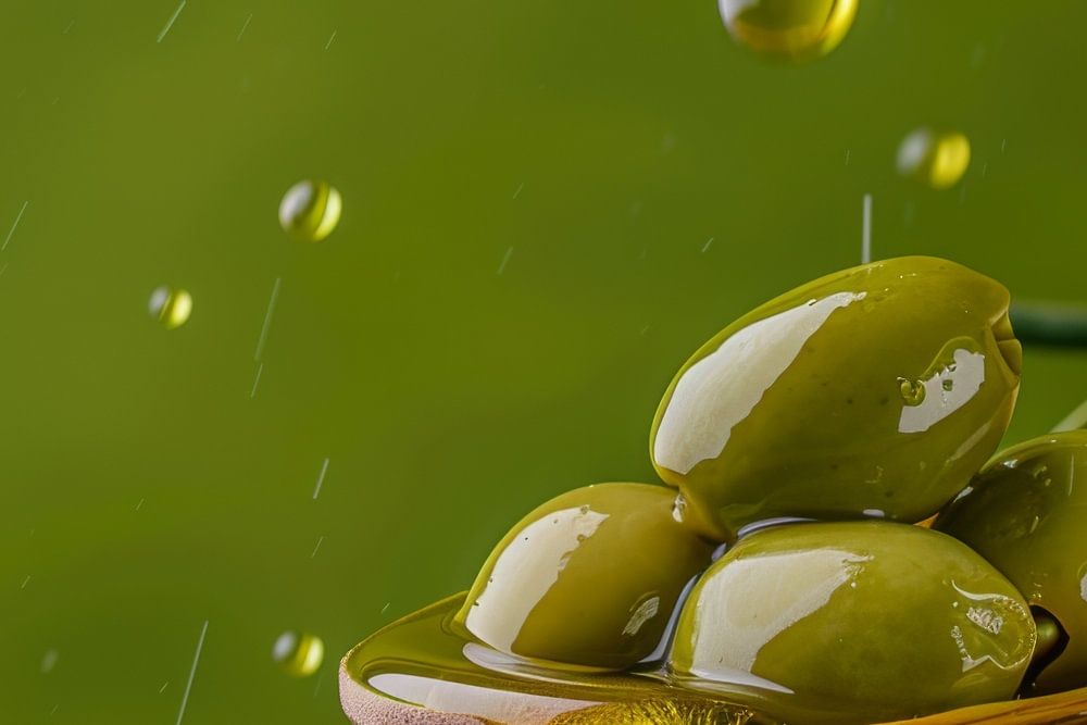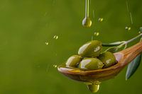 Deze levendige afbeelding vangt de essentie van de mediterrane keuken door verse olijven en druipende olijfolie te tonen in een harmonieuze compositie. De rijke groene tinten van de olijfbladeren en de gouden glans van de olijfolie stralen frisheid en natuurlijkheid uit. Dit kunstwerk is ideaal voor keukens, restaurants of gastronomische hoekjes en brengt de smaken en kleuren van de Middellandse Zee direct in je interieur.