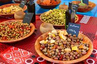 Rustieke schalen met Italiaanse olijven uit Sicilië en flessen olijfolie, épicerie in Beaune, Bourgogne (Bourgondië) Frankrijk. De vruchten van de olijfboom (Olive Europaea) zijn populair in landen rond de Middellandse Zee. In Italië heten ze antipasti en in Spanje tapas. Mooie decoratie in de keuken of in restaurant.
