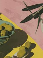 Olijven. Hippe illustratie, helemaal van nu. Hiermee haal je zowel de lente als de zomer in huis. Fris en kleurrijk in geel, groen en roze
