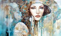 Abstract collage portret van een vrouw in voornamelijk wit,goud en turquoise tinten.