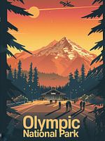 Leg de vredige wildernis en grootsheid van het noordwesten van de Stille Oceaan vast met deze suggestieve reisposter voor het Olympic National Park. Met besneeuwde bergen tegen een gloeiende oranje schemering, wordt het kunstwerk omlijst door torenhoge pijnbomen en een gezellige parklodge verlicht door zacht lamplicht. Groepen bezoekers koesteren zich in de warmte van de zonsondergang en vieren de rustige ontsnapping die het Olympic National Park biedt. Deze print combineert retro reisposter-esthetiek met moderne illustratie en is daardoor ideaal als wanddecoratie voor natuurliefhebbers, avonturiers of iedereen die gepassioneerd is door beschermde landschappen en schilderachtige bosgezichten. Hang dit stuk in woonkamers, hutten of kantoren en voeg een vleugje wilde majesteit toe aan je omgeving. De gedetailleerde compositie, dramatische kleuren en uitnodigende sfeer roepen herinneringen op aan onvergetelijke wandelingen, zonsondergangen en de tijdloze vreugde van dicht bij de natuur zijn. Breng de betovering en sereniteit van Olympic National Park naar huis met deze stijlvolle poster die Amerika's geliefde nationale parken en levendige wildernis eert.