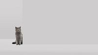 Grijze Britse korthaar kat kijkt om de hoek in een grijze kamer, minimalistisch met alleen vlakken.