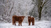 Twee kleine Schotse hooglander kalfjes staan in een besneeuwd landschap, waarschijnlijk de eerste keer dat ze sneeuw zien. Ze kijken nieuwsgierig om zich heen, alles vinden ze interessant, zelfs mij met mijn camera. Ze zijn nog klein maar hebben een dikke vacht met lange haren dus koud hebben ze het niet. Ze horen bij een grote kudde…