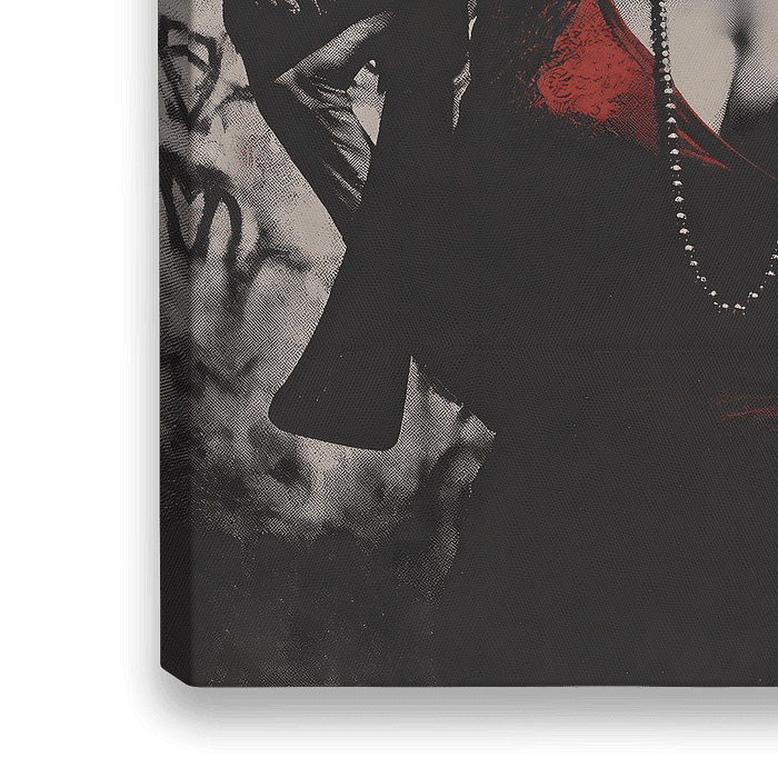 Een oudere dame met wit haar staat zelfverzekerd voor een ruwe, met graffiti bedekte muur. Ze draagt een dieprode jurk, een lange parelketting en een kanten jasje in dezelfde kleur. Ze houdt een wapen in haar hand, dat ze nonchalant maar vastberaden toont. Haar blik is koel en superieur, haar houding trots en standvastig. De afbeelding heeft een contrastrijke, gedurfde pop-artstijl, met dominante roodtinten en een raster van grove prints dat doet denken aan vintage filmposters.