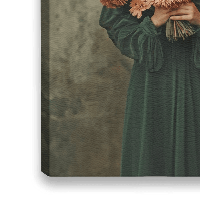 Dit beeld, met zijn warme en zachte kleurenpalet, toont een vrouw omringd door oranje dahlia's. Ze verbergt haar…