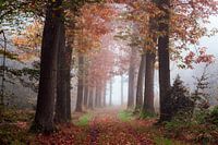 Een pad met aan weerszijden bomen bedekt met vele kleurrijke herfstbladeren op een mistige ochtend.