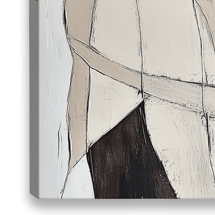 Twee abstracte figuren die zich in een innige omhelzing bevinden. De figuren zijn minimalistisch weergegeven, met zachte aardetinten zoals beige, wit en lichtbruin, afgewisseld met diep zwarte accenten die de contouren en schaduwen van de lichamen versterken. De gezichten van de figuren zijn ongedetailleerd, waardoor de nadruk ligt op…