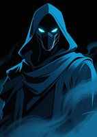 Duik in de schaduwen met deze opvallende digitale illustratie van een mysterieuze gemaskerde figuur gehuld in blauwe mist.
