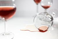 Omgekeerd drinkglas met een plas rode wijn tussen wazig staande glazen, concept voor feestvreugde, alcoholverslaving of burn out, lichtgrijze achtergrond met kopieerruimte, geselecteerde focus, zeer smalle scherptediepte