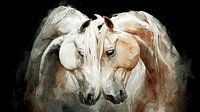Dit intense en sensuele kunstwerk, Omhelzing van Twee Paarden, toont twee paarden – één wit, één crème – die elkaars voorhoofd en neus liefdevol tegen elkaar drukken, bijna opgelost in een dramatische zwarte achtergrond.