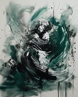 Dit intrigerende abstracte kunstwerk toont een intieme omhelzing, gevangen in een explosie van groene en zwarte penseelstreken. De vloeiende bewegingen en contrasterende kleuren roepen een gevoel van geborgenheid, emotie en kracht op. Het werk lijkt te balanceren tussen chaos en sereniteit, en benadrukt de verbinding tussen mensen te…