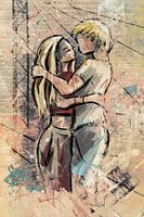 Koop dit abstracte kunstwerk Omhelzing verliefd stel op brug - semi abstract en kleurig kunstwerk van Emiel de Lange op canvas, aluminium dibond, (ingelijste) fotoprint, behang en ArtFrame, op maat geprint in Fine-Art kwaliteit.