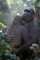 Twee jonge gorilla's houden elkaar stevig vast in tropisch regenwoud