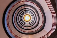 'Omhoog kijken' is een van de thema's die ik gebruik in fotografie. Je ziet dan vaak verrassende en verrassende vormen. Door het lage standpunt zie je hier de ronde vormen van een trappenhuis. De spiraalvorm van het trappenhuis geven diepte aan de verdieping van het gebouw. Je ziet daardoor de verschillende lijnen van het trappenhuis.