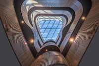 Omhoog kijken in het atrium van een gebouw. Door het lage standpunt zie je de verschillende vormen van het gebouw.