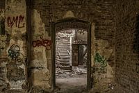 Vanuit een vervallen vertrek zie je een trap naar boven die er niet veilig uit ziet, de doorgang er naast ziet er niet veel beter uit, dit is in een verlaten fort in België
