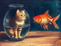 Een kat zit in een goudvissenkom en kijkt naar een oranje goudvis die buiten zwemt. De scène is grillig en ironisch en benadrukt de gebruikelijke roofdier-prooi relatie van de kat met de vis.