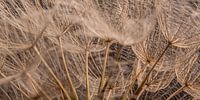 "Omringd door houtkleurige pluisjes van de Tragopogon" is een macrofoto de pluisjes van een morgenster van schuin onderaf gefotografeerd. (Deze bewerkte) foto heeft hout kleurige tinten / pastel kleuren / wit / goud kleur / champagne kleur/ bruin / beige tinten.