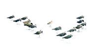 Een goudplevier omringd door kievieten in de wateren van Ezumakeeg, Friesland.