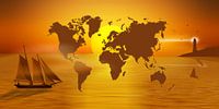 Een romantische en maritieme Wandmotiv voor zeilliefhebbers. Met een kaart van de wereld voor een sfeervolle zonsondergang. Zeilboot en de vuurtoren in oranje en bruin
