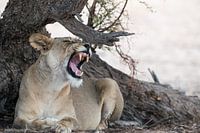 A yawning young lioness under a tree in the Kgalagadi Transfrontier park in South Africa!