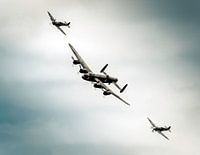 Lancaster escorted by two Spitfires. out of the era of WW II.
