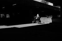 Een abstracte straatfoto van een man met veel contrast en hooglichten in zwart wit.