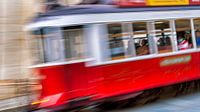 Een rijdende tram in Lissabon gefotografeerd met een lange sluitertijd om de beweging zichtbaar te maken.