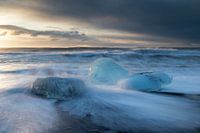IJsblokken op een van de zwarte lavastranden in het zuiden van IJsland. Het ijs is afkomstig van de nabijgelegen Breidamerkurjokull gletsjer. Het ijs van de afbrokkelende gletsjer beland via het erbij gelegen meer in zee waar de blokken dan vaak weer aanspoelen op het strand. Vanwege de kleuren en structuren van het ijs staat dit strand ook wel bekend als Diamond Beach.