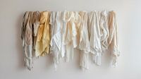 Een reeks delicate, getextureerde stoffen hangt tegen een lichtgekleurde muur. De doeken vertonen een gradiënt van zachte, neutrale tinten, variërend van lichtbeige en zachtgeel tot puur wit. De stoffen zijn losjes gedrapeerd, waardoor zachte plooien en golven ontstaan die de compositie een gevoel van beweging geven. De algehele esthetiek is sereen en minimalistisch.