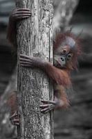 Onafhankelijke baby orang-oetan daalt voorzichtig en behoedzaam de stam van een boom af