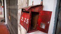 rode, open, gedeeltelijk verroeste brievenbus op een huismuur