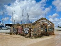 Onbewoonbaar met graffiti bij een haven in Portugal.
