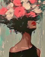 Boven haar hoofd is een weelderige bloemencorona zichtbaar, bestaande uit roze en witte bloemen, geschilderd met losse, expressieve penseelstreken die een dromerige, bijna etherische sfeer…