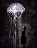 Een surrealistisch meesterwerk dat schoonheid en duisternis combineert in een dromerige, bijna buitenaardse scène. De afbeelding toont een vrouw in zijaanzicht, gekleed in een eenvoudige zwarte jurk en hoge zwarte laarzen. Haar silhouet straalt kracht en mysterie uit terwijl ze tegen een diepzwarte achtergrond staat. Het enige licht in de ruimte komt van een immense witroze kwal die boven haar zweeft, haar gloed weerspiegelt op de vrouw en de omliggende leegte.