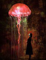 De kwal is de centrale focus van de compositie. Haar doorschijnende, lichtgevende lichaam lijkt bijna etherisch, terwijl haar lange, dunne tentakels zich in perfect parallelle lijnen uitstrekken naar de grond, als fragiele draden van licht. De tentakels creëren een hypnotiserend patroon dat de kijker leidt door het beeld en tegelijkertijd een gevoel van beweging oproept. De rode accenten van de kwal worden versterkt door subtiele reflecties op de vrouw en haar omgeving, wat een dromerige, bijna vloeibare sfeer toevoegt aan de compositie.
