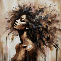 Een vrouw met diepdonker, golvend haar komt tot leven in rijke lagen olieverf, omhuld door tinten beige, bruin en goud. Haar aanwezigheid is stil maar krachtig, alsof ze haar verhaal fluistert in schaduwen en licht. De warme achtergrond contrasteert subtiel met haar donkere lokken, waardoor ze lijkt op te lichten vanuit het doek. Elk penseelstreek vangt een glimp van zachtheid, mysterie en innerlijke diepte. Een ode aan stille kracht en natuurlijke schoonheid.