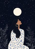 Dit kunstwerk toont een vrouw met lang haar en goudkleurige oorbellen. Ze draagt een witte jurk met blauwe bladpatronen en staat afgebeeld tegen een donkere sterrenhemel, met een grote volle maan boven haar. Om haar heen zijn blauwe bladeren te zien, wat zorgt voor een natuurlijke en rustige sfeer. De eenvoudige lijnen en heldere kleuren geven het geheel een moderne en minimalistische uitstraling, terwijl het tegelijkertijd een gevoel van kalmte en reflectie oproept.