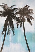 Het beeld doet denken aan een moment van sereniteit op een tropisch eiland, waar de palmbomen zachtjes bewegen in de bries. De helderheid van de zon is voelbaar, maar tegelijkertijd biedt de compositie van de zwart-witte silhouetten een gevoel van stilte en tijdloze schoonheid, perfect in balans met de levendige, maar vervaagde kleuraccenten van het rood. Het tropische gevoel wordt verder versterkt door de zwoele sfeer die ontstaat uit de combinatie van de natuurlijke vormen van de palmbomen en de lichte, toch dynamische achtergrond.