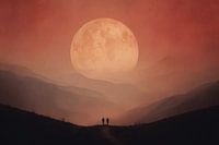 Twee figuren lopen het onbekende tegemoet, terwijl een gloeiende rode maan boven mistige bergen oprijst en eenzaamheid en kosmische verwondering samenkomen